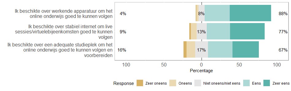 De meest gebruikte online tools ten behoeve van het online onderwijs waren Zoom (42%), vooraf opgenomen presentaties van de docent (20%), andere online content (bijvoorbeeld eerder opgenomen webcolleges en YouTube-filmpjes; 16%) en Forum functie in Canvas (12%). De respondenten vonden Zoom (51%) het beste werken, gevolgd door vooraf opgenomen presentaties van de docent (18%).