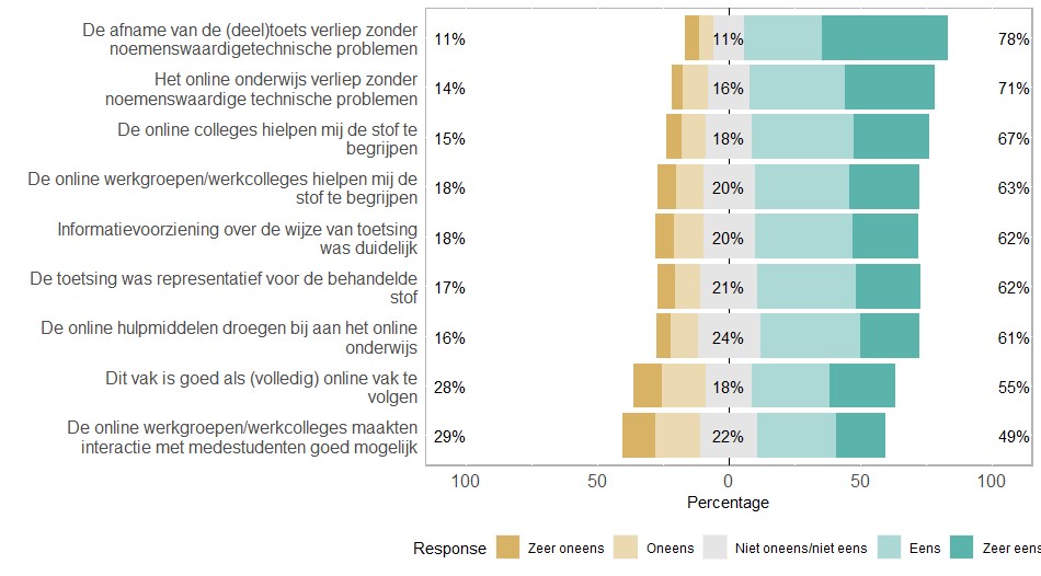 Studenten beoordeelden de mogelijkheid tot interactie met medestudenten het minst positief: 29% van de studenten gaf aan het (zeer) oneens te zijn met de stelling dat de online werkgroepen/ werkcolleges interactie met medestudenten goed mogelijk maakt. Naarmate de groepsgrootte van het vak toenam waren de respondenten positiever over de mogelijkheden het vak als (volledig) online vak te volgen. Ook vonden ze dan vaker dat de online hulpmiddelen bijdroegen aan het online onderwijs. Naarmate de groepsgrootte van het vak toenam waren de respondenten negatiever over de mate waarin de online (werk)colleges/werkgroepen hielpen de stof te begrijpen. Ook waren studenten dan minder positief over de mogelijkheden tot interactie met medestudenten en de informatievoorziening over en representativiteit van de toetsing.