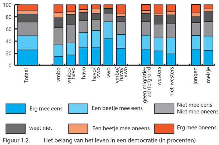 ‘Ongeveer de helft van de leerlingen in het tweede jaar van de middelbare school geeft aan democratie niet bijster belangrijk vinden of er niets van te vinden. Dat is op zich ook niet zo vreemd op die leeftijd’, vertelt politicoloog Tom van der Meer, een van opstellers van het rapport. ‘Zorgelijk zijn de grote verschillen in democratische hechting die al op deze leeftijd bestaan tussen met name vwo-leerlingen en vmbo-leerlingen. Vooral op het vwo vinden leerlingen het leven in een democratie belangrijk (71%); op het vmbo is de steun veel lager (34%) en de grootste groep vmbo’ers (45%) heeft er geen mening over.