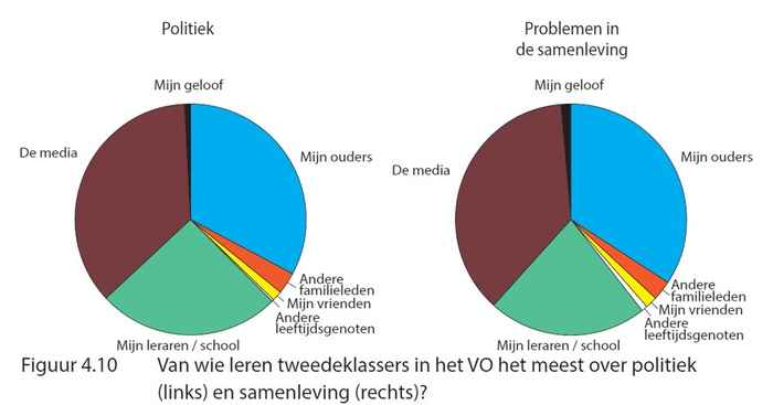 ‘Ze praten ook minder vaak met ouders en vrienden over problemen in de samenleving. Wel praten zij in jaar 2 wat vaker met leraren over de politiek in Nederland’, schetst socioloog en co-auteur Paula Thijs. ‘Ook kunnen zij in jaar 2 meer politieke partijen noemen. Leerlingen zeggen het meest over politiek en maatschappij te leren van de media, gevolgd door ouders en de school.’