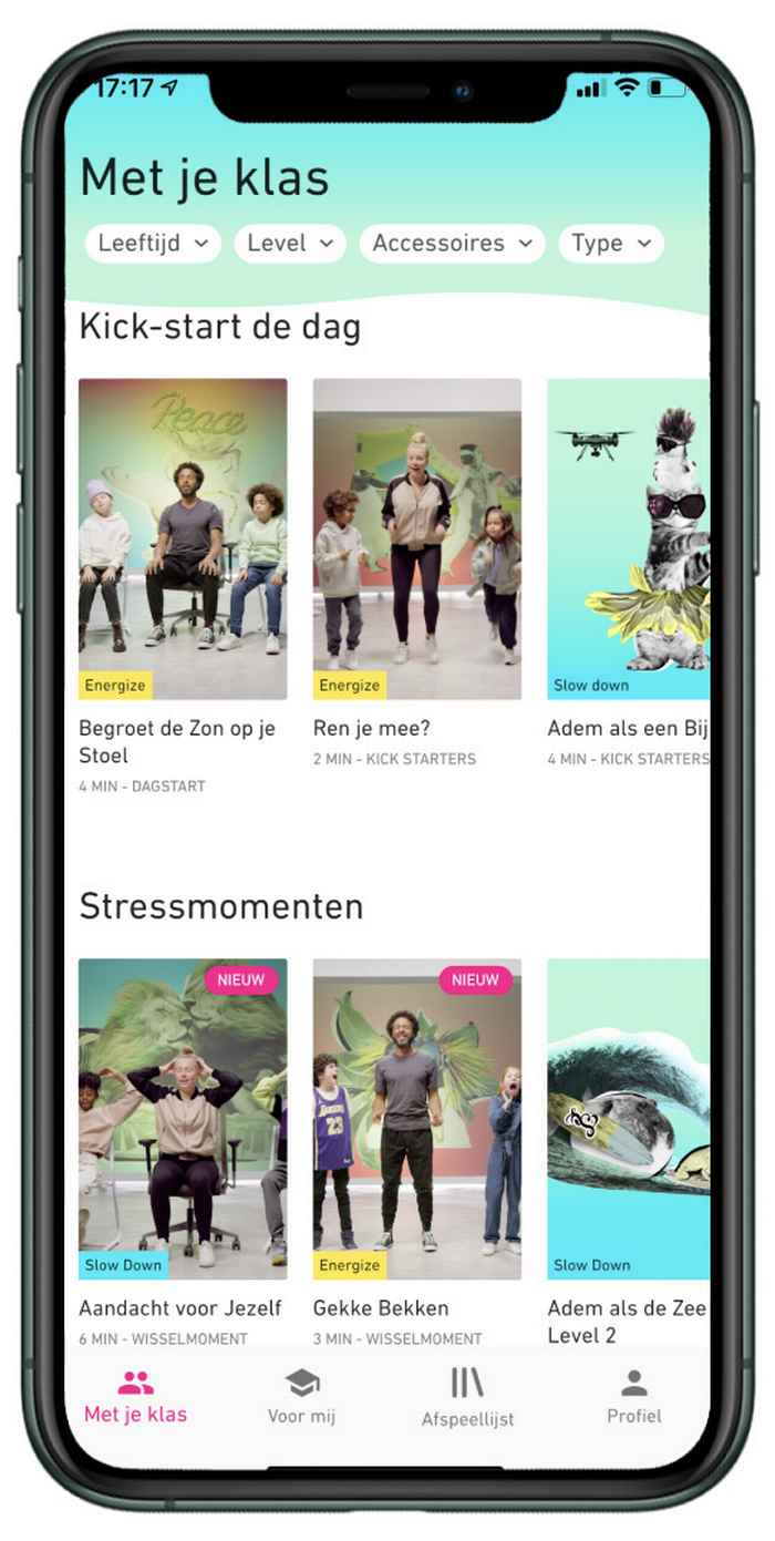 Er zijn in de app oefeningen voor zowel de leerlingen als de leerkrachten. Zo krijgen leerkrachten bijvoorbeeld korte oefeningen aangereikt om met de kinderen te gebruiken op momenten dat er een gespannen of stressvolle sfeer in de klas is. De oefeningen kunnen worden gekozen afhankelijk van de behoeften van de leerlingen op dat moment, om het energieniveau in de klas te verlagen of juist te verhogen. Daarnaast kunnen de leerkrachten met de app ook persoonlijke oefeningen doen tijdens de werkdag om hun stress te verminderen.