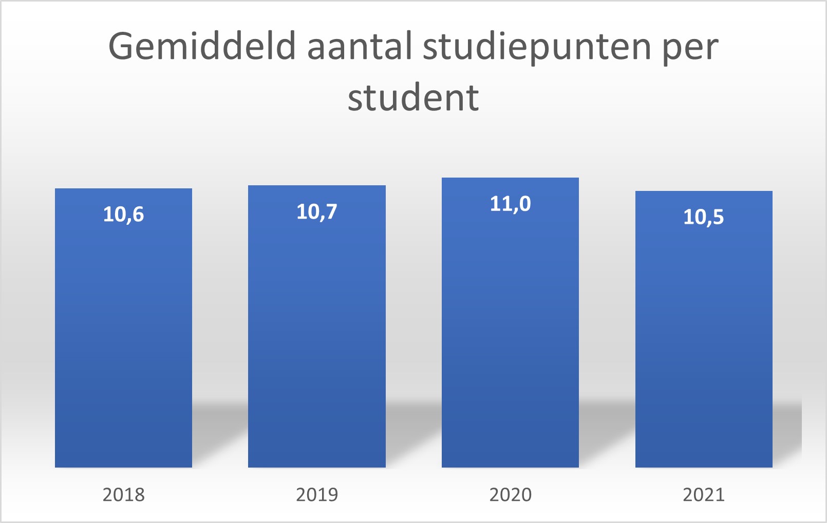 In de eerste drie maanden van dit studiejaar liep het gemiddeld aantal behaalde EC’s (studiepunten) ietsje terug, van 11 vorig jaar naar 10.5 dit jaar. Het percentage geslaagde studenten per vak nam juist heel licht toe, van 96.4% naar 96.9% (+0.5%). Het gemiddelde tentamencijfer verschilt ook nauwelijks, met 7.6 dit jaar tegenover 7.57 vorig jaar.