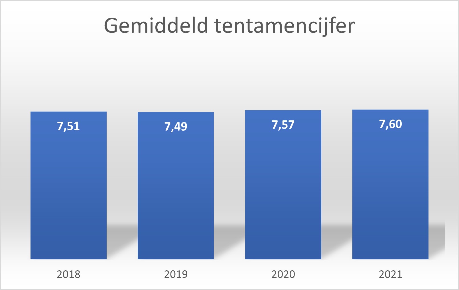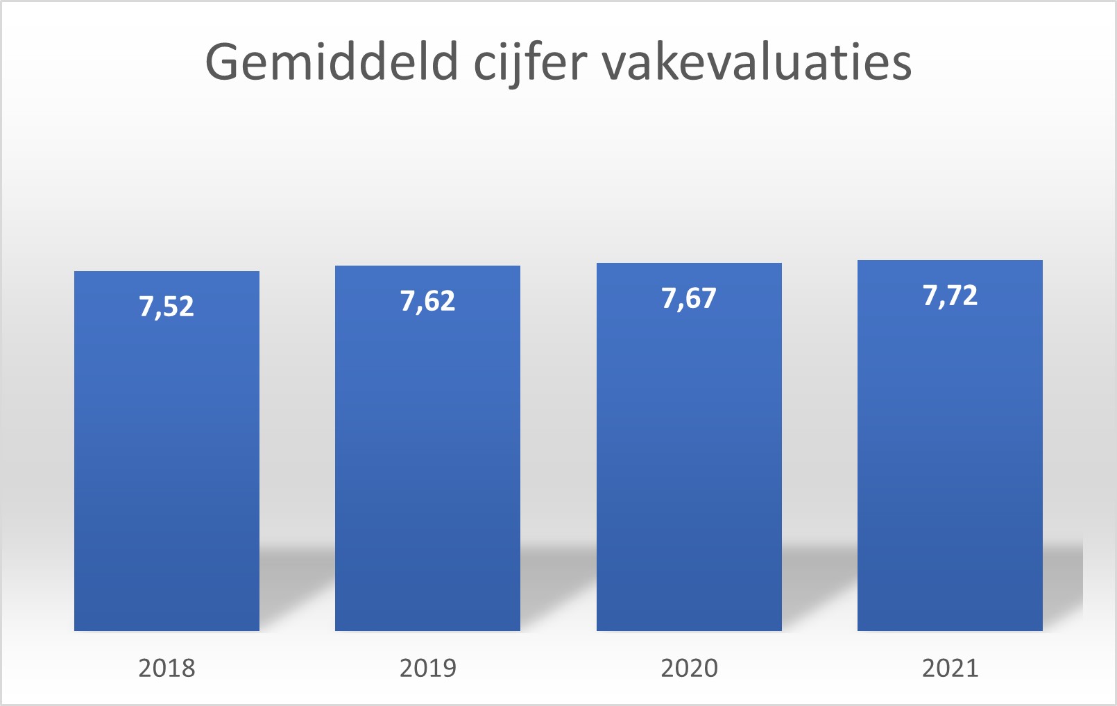 Ook de waardering door studenten voor de vakken die ze volgden, was in de periode september t/m november 2022 vergelijkbaar met diezelfde periode in voorgaande jaren: van 7.67 in 2020-2021 naar 7.72 dit studiejaar.