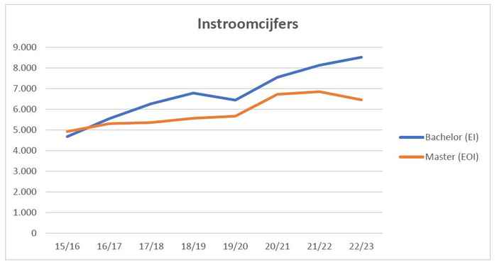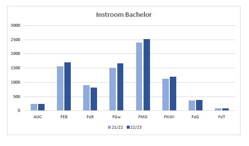 Het aantal eerstejaarsstudenten bij de bacheloropleidingen stijgt met +4,8%, van 8.126 vorig jaar naar 8.512 dit jaar. Het aantal nieuwe bachelorstudenten uit Nederland stijgt met +3,4%: 4.963 dit jaar versus 4.801 vorig jaar. De internationale groei is sterker: +6,7%: van 3.325 naar 3.549. Vooral het aantal bachelorstudenten van buiten de Europese Economische Ruimte (EER) stijgt: van 1.036 naar 1.184 (+14,3%). Het aantal uit de EER neemt in mindere mate toe: van 2.289 naar 2.365 (+3,3%).