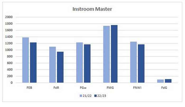 Dit jaar zijn er 6.448 nieuwe studenten bij de masteropleidingen. Dat zijn er 398 minder dan vorig jaar toen het er 6.846 waren (-5,8%). Zowel het aantal nieuwe masterstudenten uit Nederland loopt terug, van 4.249 naar 3.850 (-9,4%), als dat uit EER-landen, van 1.610 naar 1.569 (-2,5%). Het aantal van buiten Europa stijgt juist, van 987 naar 1.029 (+4,3%).