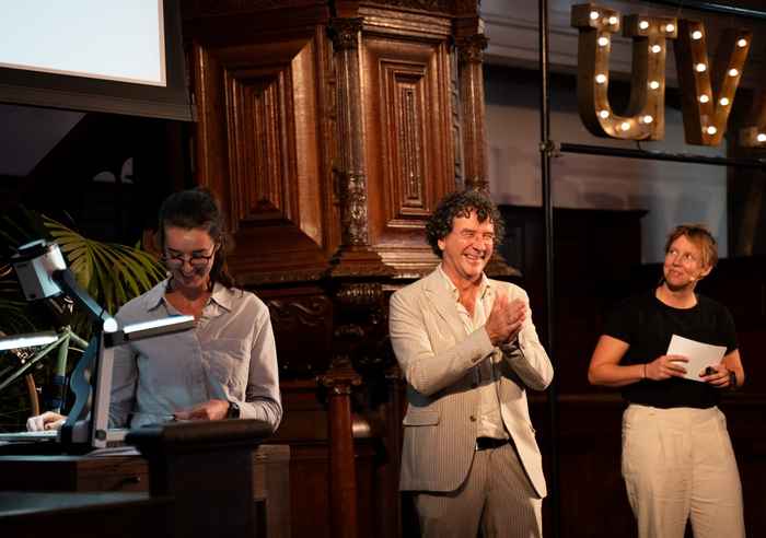 We staan er vaak niet bij stil, maar onze kleding is een grote bron van microplastics. Ze komen in ons waswater terecht en breken nauwelijks af. We weten niet hoeveel of wanneer ze vrijkomen. Milieuchemicus Antonia Praetorius, geograaf Lies Jacobs en junior onderzoeker Bernou Boven verzamelden waardevolle data, door honderd burgerwetenschappers te laten wassen voor de wetenschap. Ook in de Aula openden de wetenschappers de jacht op microplastics. Ze vroegen het publiek ter plekke om een aantal vezels van hun kleding beschikbaar te stellen voor onderzoek.