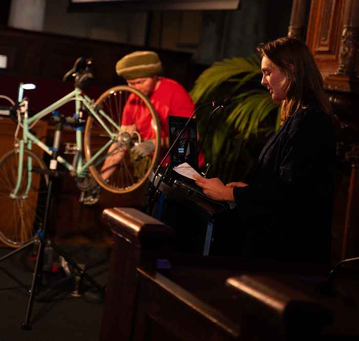 Veertig procent van de Amsterdammers gooit producten weg die nog gerepareerd hadden kunnen worden. Hoe kunnen we de verbinding versterken tussen mensen, stad en product? En op welke manier kunnen we duurzaamheid tastbaar maken, zodat mensen bewuster met hun spullen omgaan? Daarover sprak UvA-student Romee Nicolai. Nicolai is projectleider bij Bike Kitchen UvA, een do-it-yourself-fietsreparatieplaats op de Roeterseilandcampus. Terwijl Romee sprak, repareerde Head Mechanic Woytek Redzynia op het podium haar fiets. Dankzij Bike Kitchen zijn er minder weesfietsen in Amsterdam. Het is bovendien een proeftuin voor maatschappelijk- en wetenschappelijk onderzoek.
