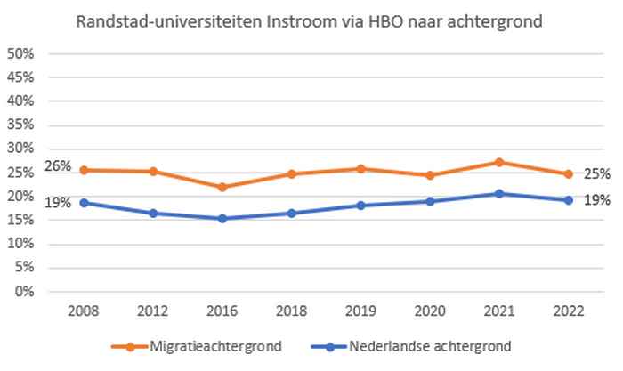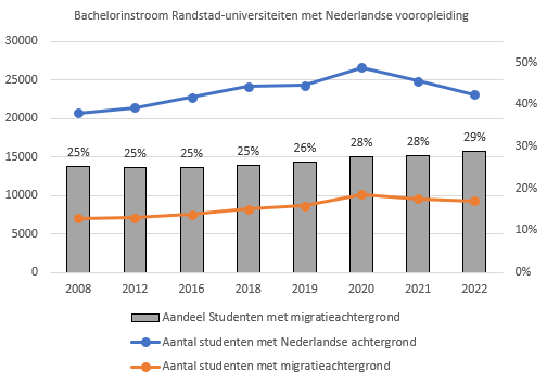 De bachelorinstroom van studenten met een Nederlandse vooropleiding én migratieachtergrond neemt in het algemeen in aantallen toe. We zien vooral een forse stijging van het aantal studenten met een Aziatische of Marokkaanse achtergrond. Maar het aandeel dat deze studenten uitmaken van de totale studentenpopulatie stijgt minder: van 25% in 2008 naar 29% in 2022, wat in stedelijke gebieden en haar omgeving nog steeds als een bescheiden aandeel kan worden gezien.