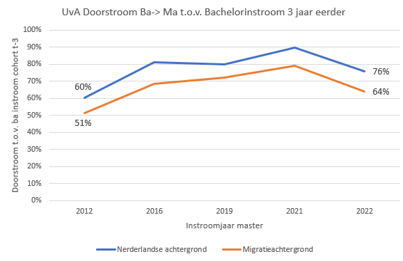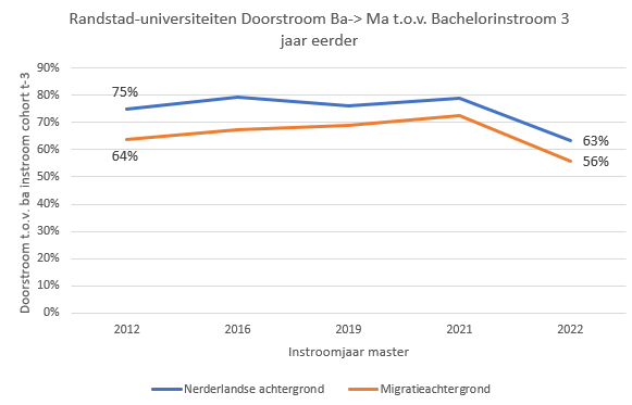 Als we de masterinstroom met de bachelorinstroom van drie jaar eerder vergelijken, de duur van een bacheloropleiding, blijkt de ‘doorstroom’ van studenten met een migratieachtergrond in het algemeen gemiddeld 10% lager dan van studenten met een Nederlandse achtergrond. Binnen de onderzochte universiteiten stromen dus minder migratieachtergrond studenten door naar een master aan één van die universiteiten. Uit de cijfers is niet op te maken of studenten naar een niet-onderzochte universiteit zijn doorgestroomd of de arbeidsmarkt hebben betreden. Hier zou dus nader onderzoek op zijn plaats zijn, om goed te kunnen reageren op deze mogelijk beperkte doorstroom van studenten met een migratieachtergrond. Beperkte deelname aan een master betekent namelijk ook dat verder op de academische ladder deze groep ondervertegenwoordigd blijft.