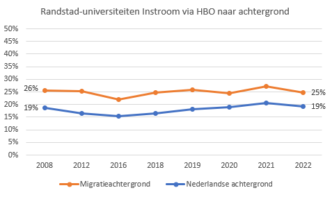 Bij de onderzochte universiteiten komt een iets groter deel van de studenten met een migratieachtergrond binnen via de hbo-route. Uitgaande van instroom via vwo en hbo, komt 25% van de studenten met een migratieachtergrond binnen via het hbo, versus 19% van de studenten met een Nederlandse achtergrond. Bij de UvA is dit 28% om 23%. In de data is geen onderscheid gemaakt tussen studenten met een hbo-propedeuse of een hbo-bachelor diploma. Bij de UvA is de route via hbo-ba iets lastiger geworden na 2011. De groei in hbo-instroom is bij de UvA dan ook relatief laag onder studenten met migratieachtergrond.