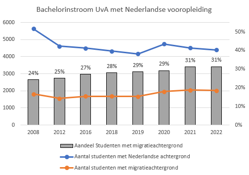 Zoomen we in op de UvA, dan zien we een iets ander beeld. Ook hier zien we een stijging van het aantal studenten met een migratieachtergrond, vooral van studenten met een Marokkaanse achtergrond. Tegelijkertijd daalde de bachelorinstroom van studenten met een Nederlandse achtergrond met 22%. Hierdoor is naar verhouding het aandeel studenten met een migratieachtergrond in de populatie studenten met een Nederlandse vooropleiding gestegen naar 31%. In vergelijking met andere Randstedelijke universiteiten is dat een relatief grote stijging.