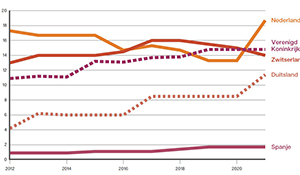 Vergeleken met Duitsland, Spanje, het Verenigd Koninkrijk en Zwitserland loopt Nederland voorop wat betreft politici met een migratieachtergrond in het parlement. Wel zagen we na 2012 een langzame afname, gevolgd door een snelle stijging bij de Tweede Kamerverkiezingen van 2021.