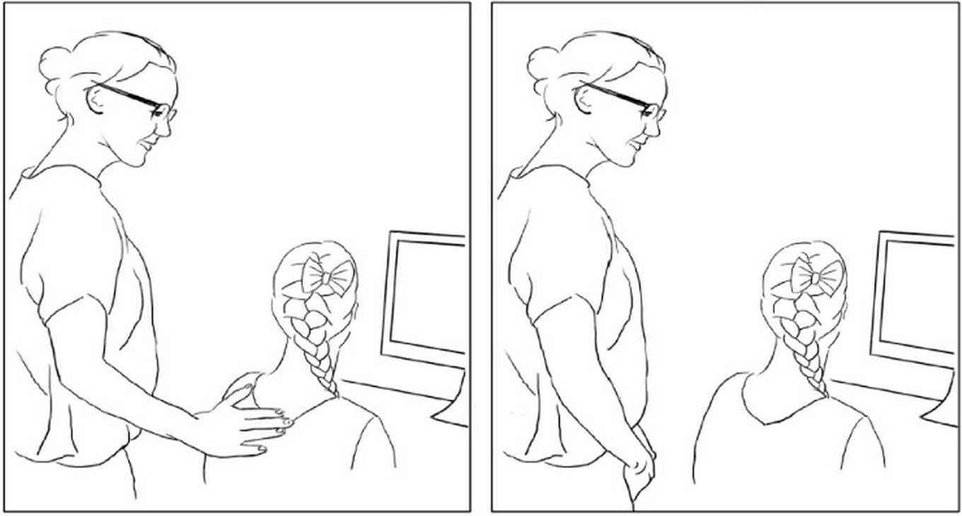 Terwijl ouders in een aparte ruimte wachtten, voltooiden de kinderen in het onderzoek eerst een vragenlijst over hun sociale angst. Buiten het medeweten van de kinderen, werden de ouders geïnstrueerd over het al dan niet aanraken van hun kind (kort en zachtjes op de achterkant van de schouder). De ouder ging naar binnen, raakte het kind wel of niet aan, vertelde het kind dat hij/zij zelf op een andere computer gingen werken - zie afbeelding - en liep naar deze computer (in dezelfde ruimte, achter een vouwscherm, uit het zicht van het kind). Vervolgens deden kinderen taken die maten hoe bedreigend ze de wereld vonden: hoeveel aandacht ze hadden voor sociale dreiging en hoeveel vertrouwen ze hadden in onbekende andere kinderen.