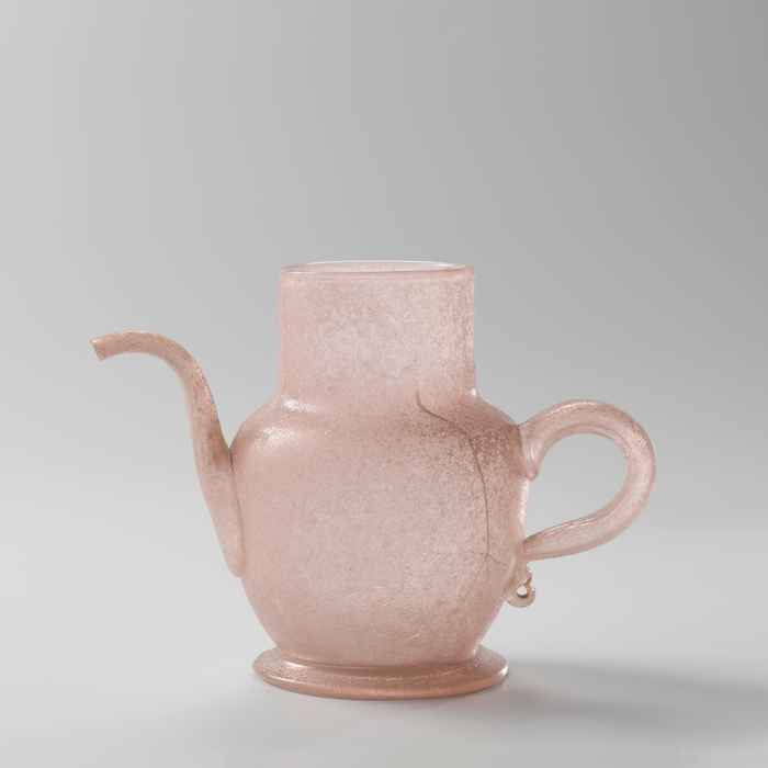 Verhaar pakt er een zakje bij waarin het fraai-gevormde dekseltje van de kan – tevens mat poederroze – in gruzelementen ligt. Het betreft een heftig geval van wat ‘ziek glas’ genoemd wordt – al spreekt Verhaar liever van instabiel glas. Het oppervlak van instabiel glas reageert met vocht uit de omgeving, daardoor trekt water in het glas. Als dit vervolgens verdampt zorgt het verlies aan volume voor spanning in het materiaal. Daardoor ontstaan kleine barstjes, het glas komt er mat uit te zien en loopt het risico te barsten, zoals het dekseltje van de roze waterkan. De grote boosdoeners in dit destructieve proces zijn hoge luchtvochtigheid en idem temperaturen – omstandigheden waar glaswerk tijdens tentoonstellingen soms aan wordt blootgesteld.