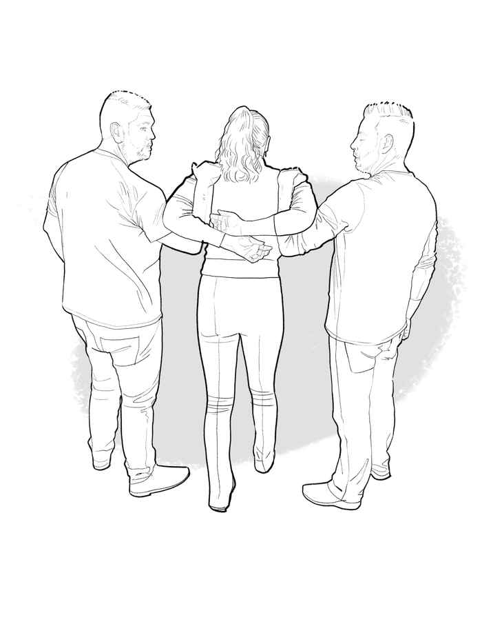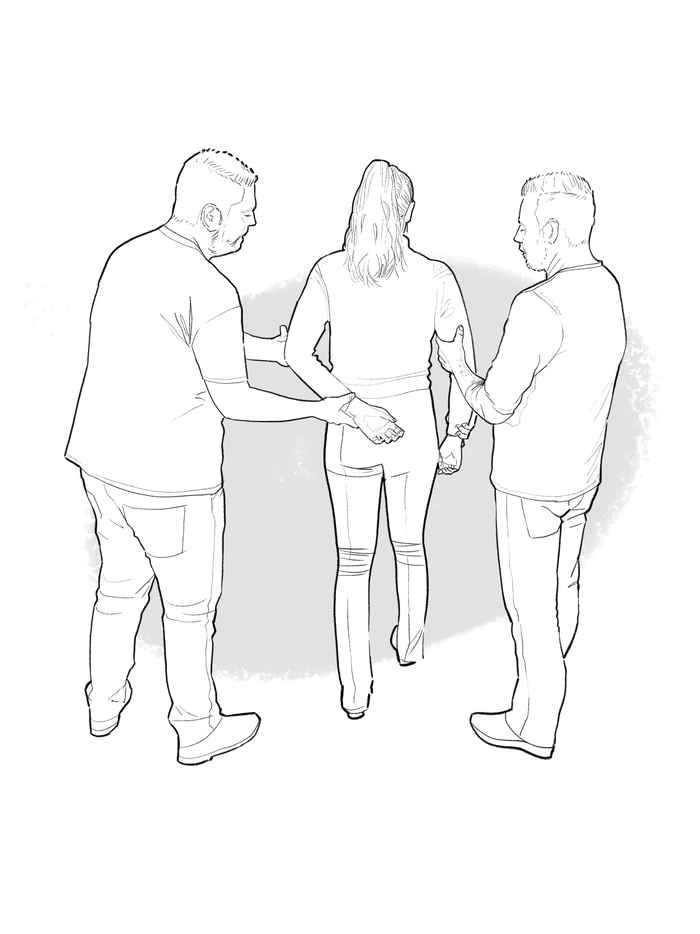 'Beveiligers pakken tijdens een kroeg- of clubnacht vaak de drukste route door een zaal, zodat ze opgemerkt worden door zo veel mogelijk mensen. Iemand die het idee heeft gezien te worden, gedraagt zich anders', zegt Van Rompu. Haar vier sets zijn opgedeeld in kijkwerk, praatwerk, het inzetten van subtiele fysieke aanrakingen en het toepassen van gesloten geweld. 'Kijkwerk is de basis; iemand aankijken die te wild danst of even oogcontact maken met iemand die anderen lijkt te irriteren. Maar als een bezoeker escaleert is er ook meer externe druk nodig om de controle terug te krijgen.'