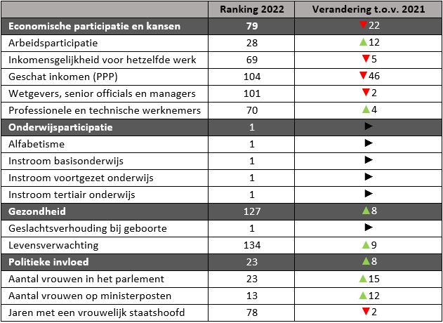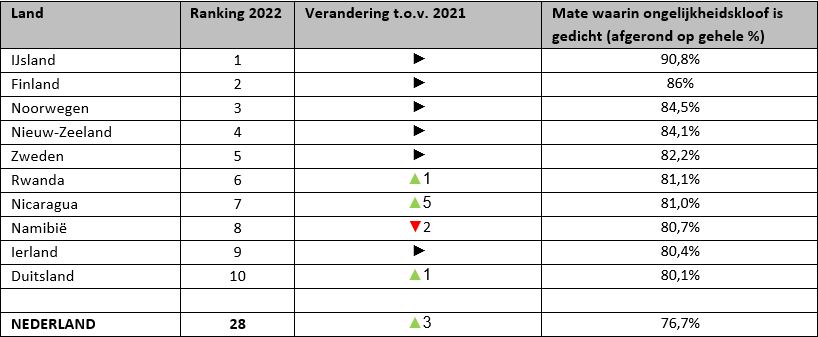 Wereldwijd is de gelijkheid tussen mannen en vrouwen lichtelijk toegenomen, maar nog niet hersteld van een coronadip. De Gender Gap is volgens de index overbrugd met 68.1%. Een hoger percentage staat voor meer gelijkheid tussen mannen en vrouwen. Als deze lijn doorzet, duurt het nog 132 jaar voordat er wereldwijd volledige gelijkheid tussen mannen en vrouwen zal zijn. Dit is 4 jaar minder dan bij de index uit 2021, maar nog steeds 32 jaar langer dan de verwachtte 100 jaar die werd berekend in 2020, voordat de pandemie uitbrak.
