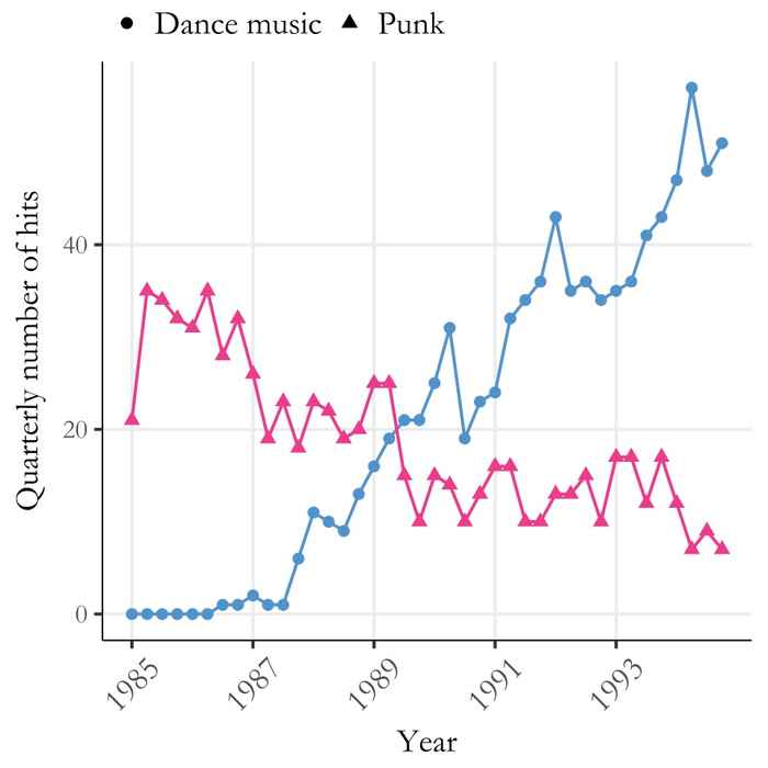 ‘De theorie van genres – dat de relatie met bestaande genres en andere facetten uit de omgeving belangrijk zijn voor de ontwikkeling van een nieuw genre – kun je ook toepassen binnen clusters van verwante genres. Hier in Nederland zie je bijvoorbeeld dat trance snel populair kon worden door ondergang van de hardcore,’ aldus Wilderom.