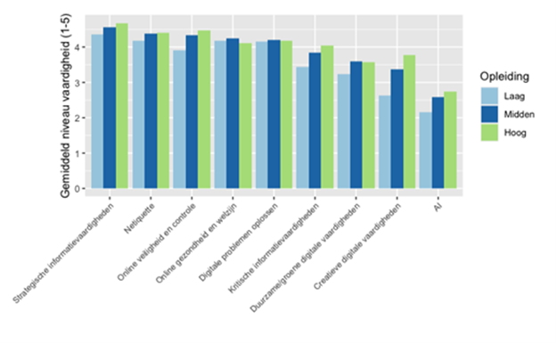 Ook constateren de onderzoekers verschillen naar opleidingsniveau. Mensen met een hoger opleidingsniveau scoren gemiddeld beter op digitale kennis en hebben meer vertrouwen in hun digitale vaardigheden. Bij creatieve digitale vaardigheden en AI-vaardigheden, zien we de grootste verschillen tussen opleidingsniveaus. Mensen die lager zijn opgeleid vinden het ook moeilijker om op een veilige manier met hun apparaten en data om te gaan en om online informatie kritisch te beoordelen. Mensen met een hoger opleidingsniveau hebben juist weer meer moeite met gezond omgaan met digitale middelen.
