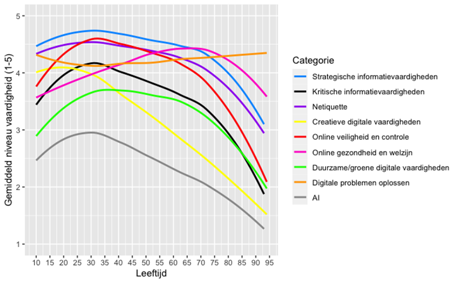 Ook blijken er duidelijke verschillen tussen leeftijdsgroepen. Kinderen en oudere Nederlanders hebben minder digitale kennis - deze neemt toe voor kinderen vanaf 10 maar weer af voor dertigers en ouder- en hebben het minste vertrouwen in hun digitale vaardigheden. Dertigers hebben juist het meeste vertrouwen. Dit geldt niet voor creatieve digitale vaardigheden, zoals presentaties of filmpjes maken. Daarin hebben kinderen en jongeren juist het meeste vertrouwen en neemt dat vanaf 25 jaar snel af. Op een gezonde manier met je digitale apparaten omgaan, zoals niet vlak voor het slapen nog gaan shoppen of gamen, vinden vooral jongeren moeilijk.