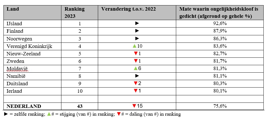 Terwijl de Scandinavische landen, maar ook het Verenigd Koninkrijk, ons buurland Duitsland en Ierland in de top-10 staan, zakt Nederland met maar liefst 15 plaatsen naar de 43ste positie. In Nederland is 75,6% van de genderkloof gedicht, een significante afname van 1,9% ten opzichte van vorig jaar. Nederland daalt met name op het gebied van politieke invloed. Op het gebied van economische participatie en kansengelijkheid blijft Nederland op een 74ste plaats staan met lichte verbeteringen op he gebied vrouwen met een managementfunctie en vrouwen in technische functies. ‘Maar die vallen in het niet bij de meer grote stappen die de Scandinavische landen en landen als het Verenigd Koninkrijk maken’, stelt Volberda. ‘De uitkomsten maken eens te meer duidelijk dat het emancipatiebeleid in Nederland moet worden herzien met nieuwe duidelijke doelstellingen. Nieuw emancipatiebeleid is nodig om Nederland in de top-10 te krijgen.’
