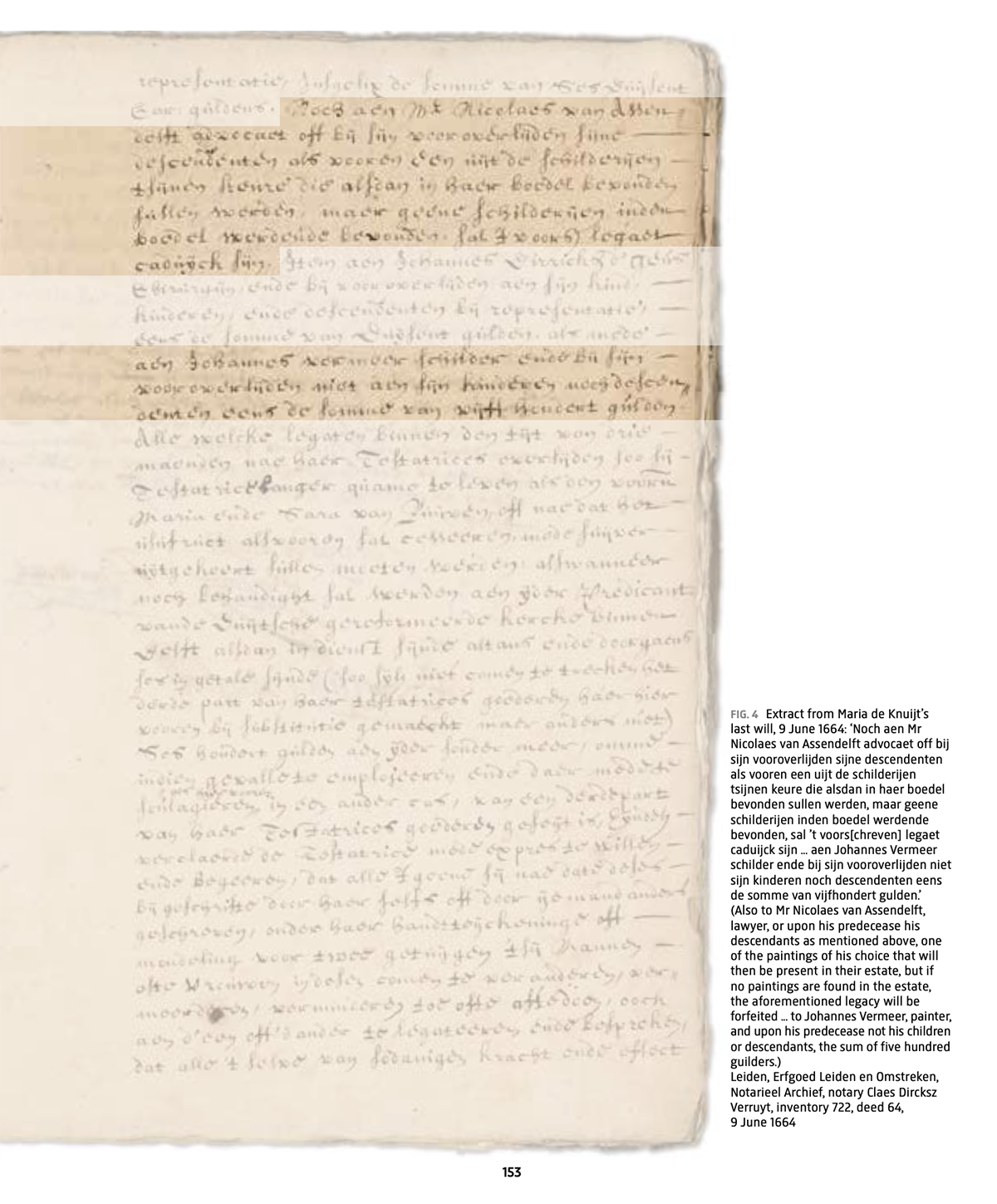 Naast nieuw ontdekte bronnen deden Bakker en Noorman en ook nieuwe inzichten op over al bekende bronnen. Zo ontdekten de kunsthistorici bijvoorbeeld De Knuijts testament uit 1664 waaruit blijkt dat ze al langer de wens koesterde om een bedrag van 500 gulden aan ‘Johannes Vermeer schilder’ na te laten, in die tijd een forse geldsom. ‘Ze had de uitdrukkelijke wens dat het geld alleen voor Vermeer bestemd was, en niet voor eventuele erfgenamen’, vertellen Bakker en Noorman. ‘Ook gaf ze Nicolaes van Assendelft, een advocaat en vermoedelijk mede-kunstliefhebber, het recht om na haar dood een schilderij uit haar collectie te kiezen.’