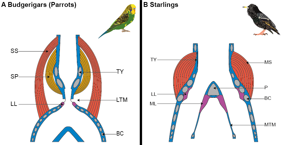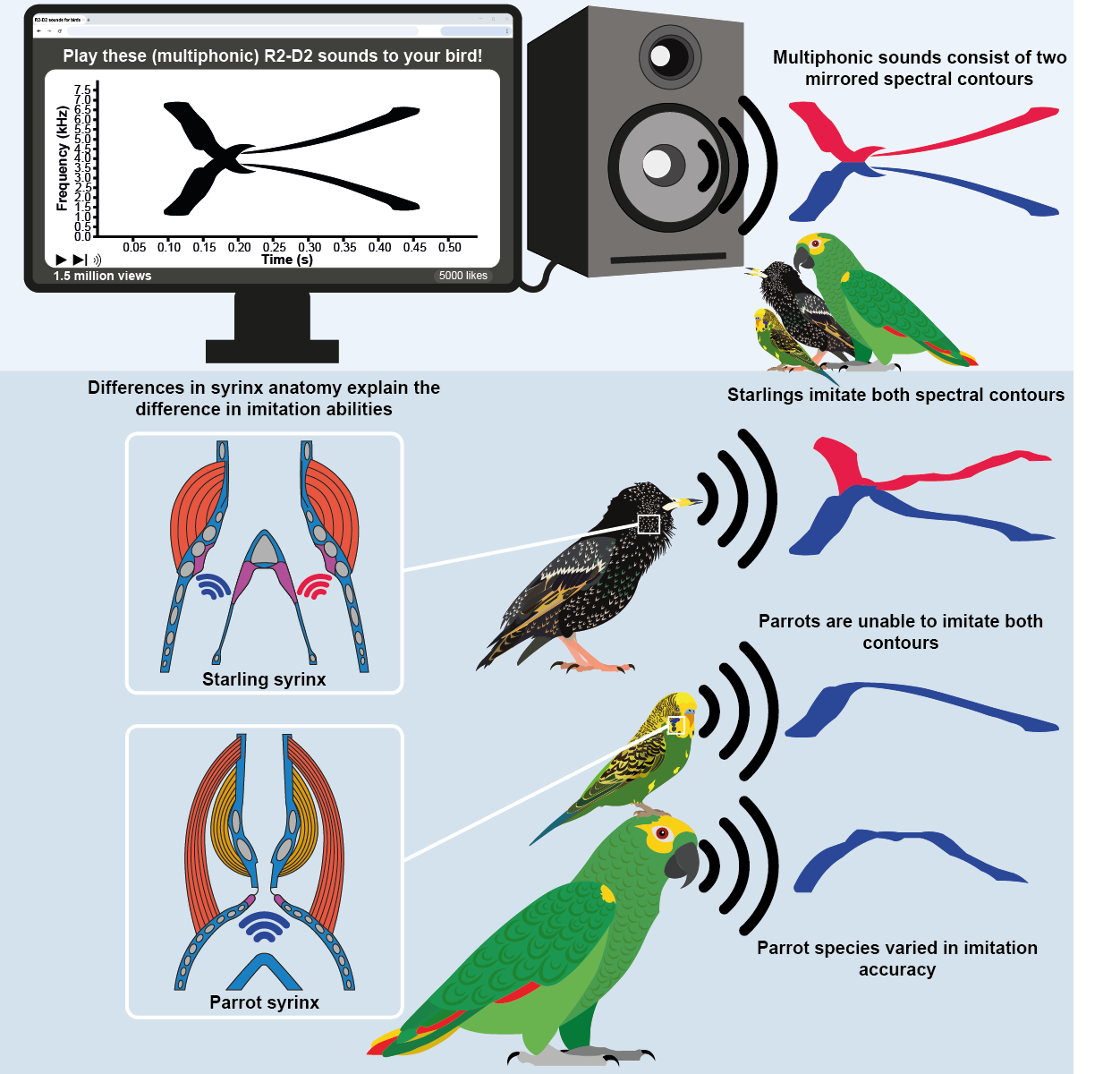 Het bleek dat spreeuwen het best waren in het imiteren van de meer complexe “multifonische” geluiden. Dat danken ze aan de unieke bouw van hun geluidorgaan, de syrinx, die twee geluidsbronnen heeft. Hierdoor kunnen spreeuwen meerdere tonen tegelijk voortbrengen, perfect voor R2-D2-achtige geluidjes.
