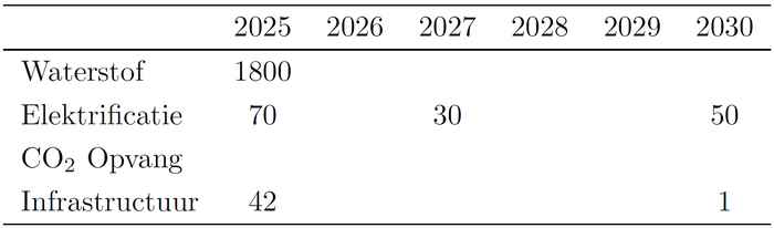 De tabellen geven een overzicht voor 2025-2030 van de totale kapitaaluitgaven (in miljoenen euro's) die het wiskundig model adviseert. De ‘initiële’ oplossing links is verkregen door te optimaliseren voor één toekomstscenario. De ‘robuustere’ oplossing rechts houdt rekening met meerdere mogelijke scenario's.