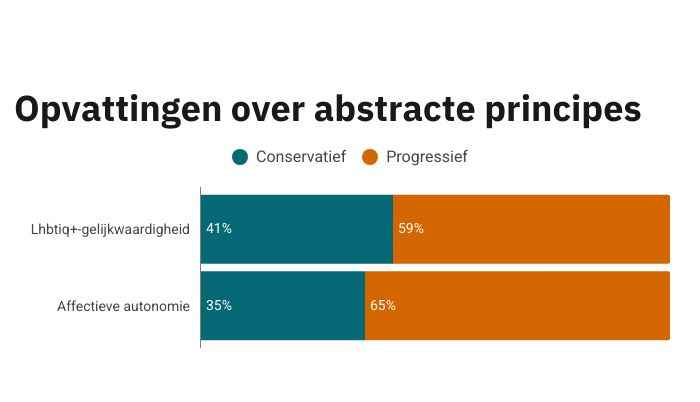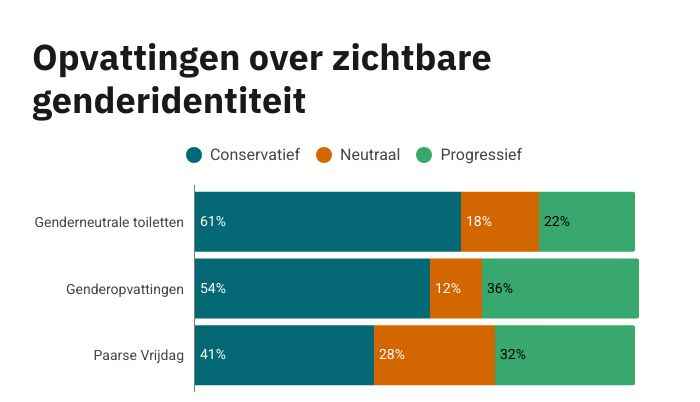 De belangrijkste conclusie: er is geen uniforme ‘generatie Z-opvatting’ over lhbtiq+. Jongeren laten een breed spectrum aan opvattingen zien: van relatief progressief tot relatief conservatief, en van het onderschrijven van gelijkwaardigheid en persoonlijke autonomie tot substantiële groepen die hier meer terughoudende opvattingen over hebben.