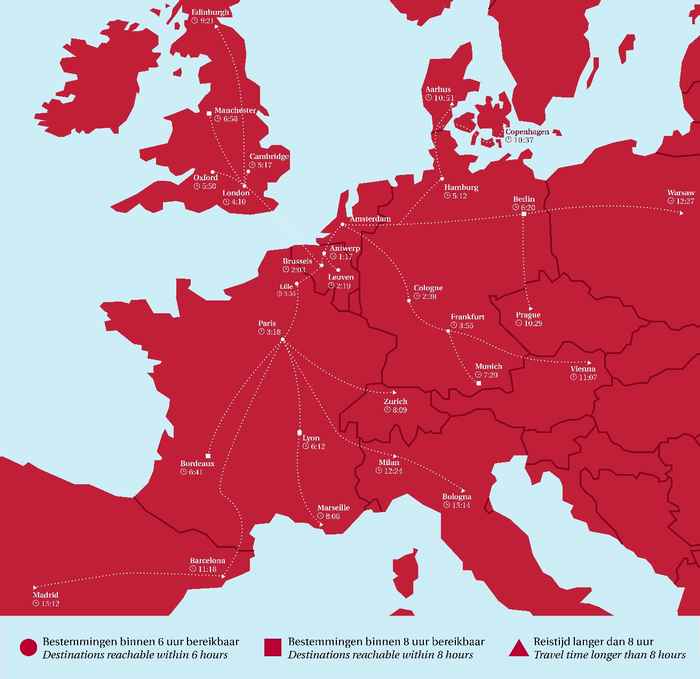 The map shows travel destinations in Europe and the time to reach them from Amsterdam: