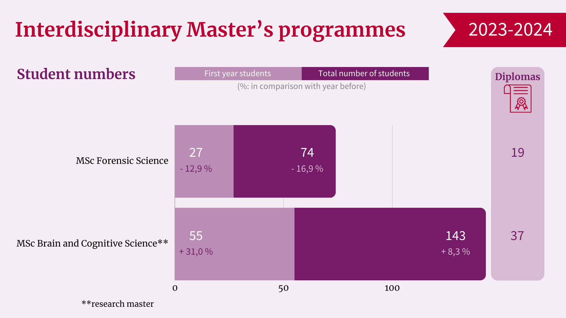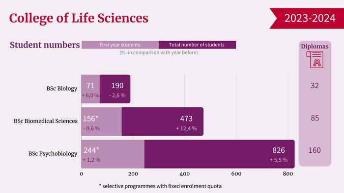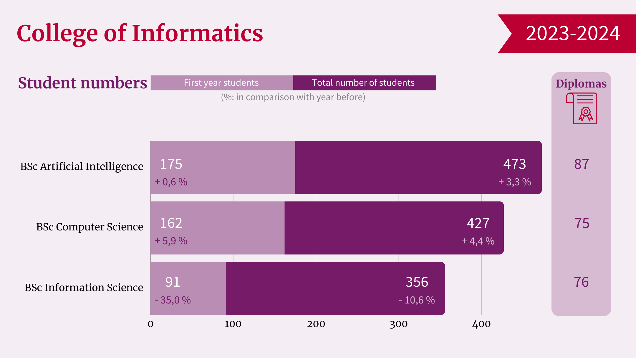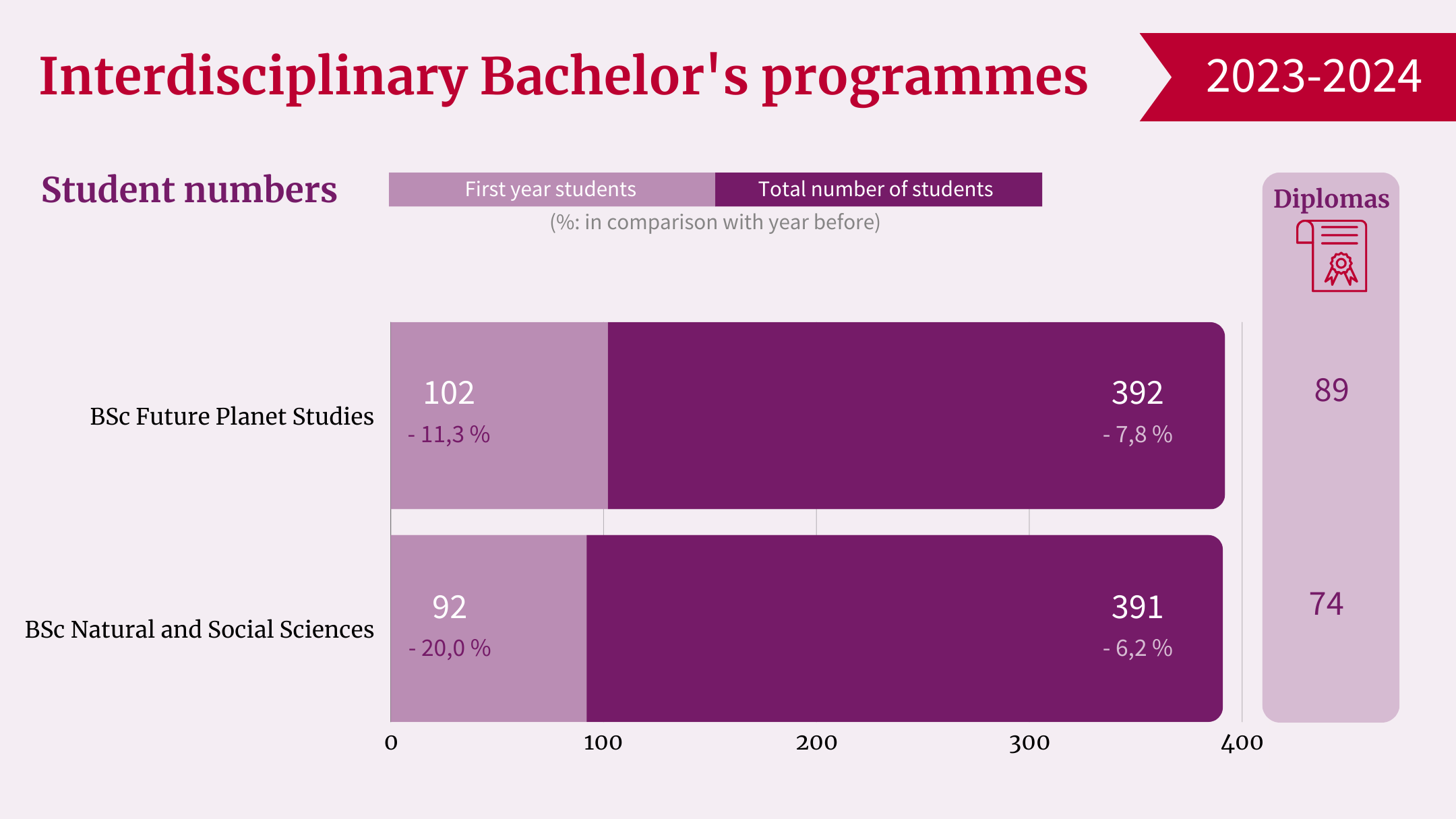The total number of students and enrolment of first-year students in 2023-2024, also in comparison to the year before, and the number of graduations.