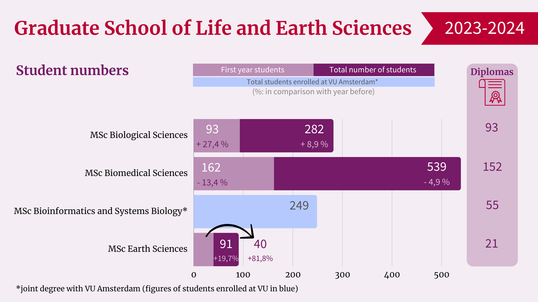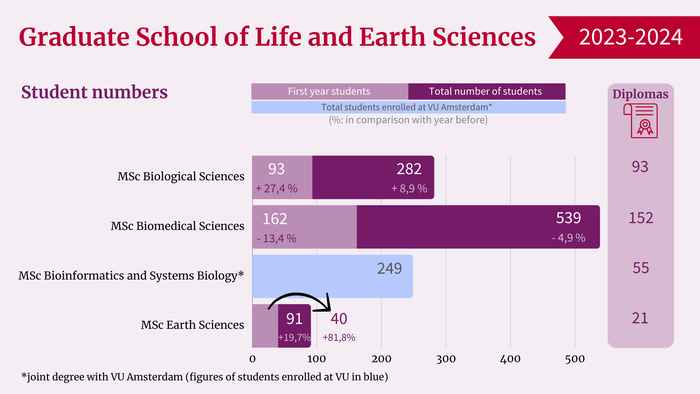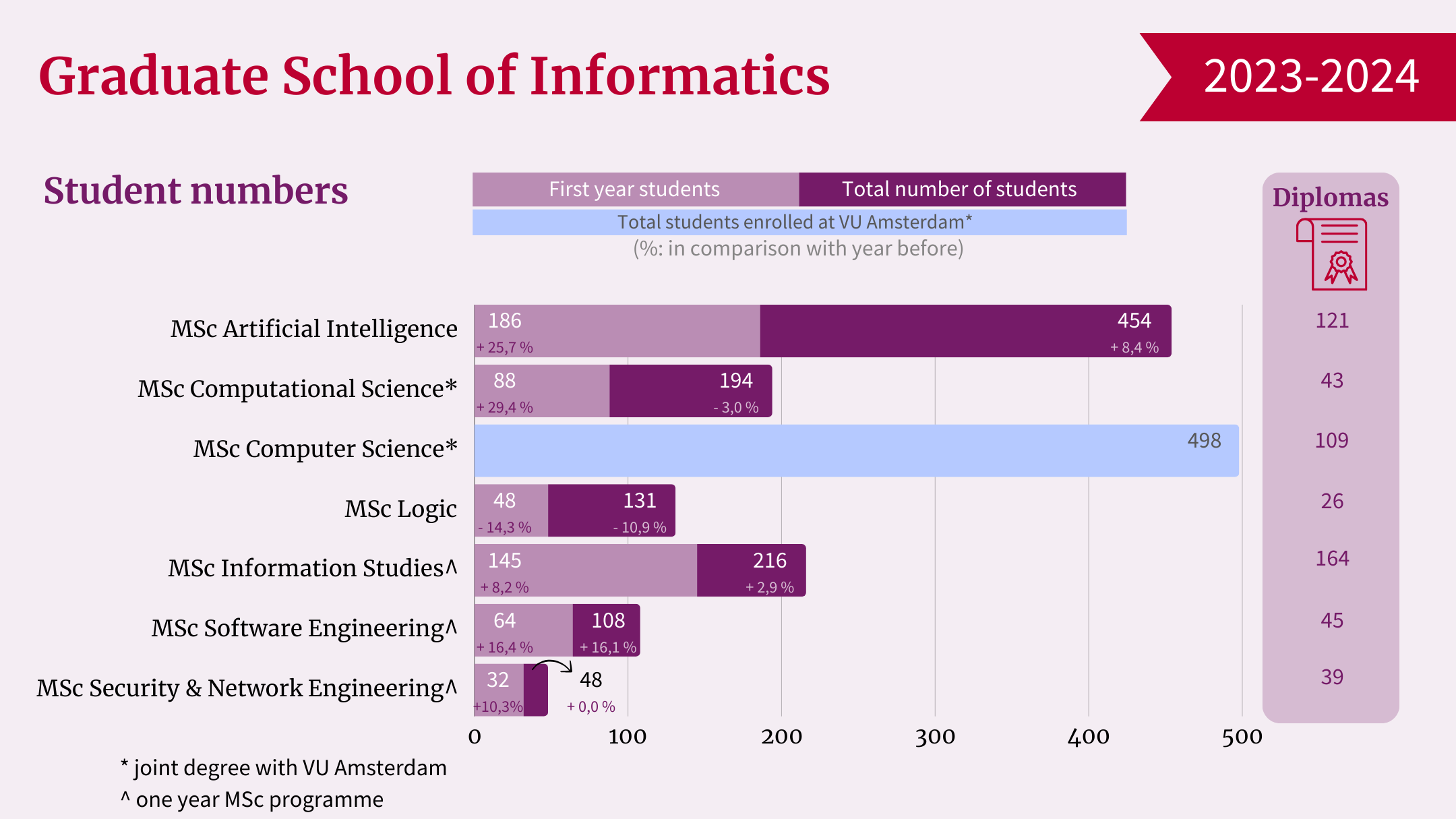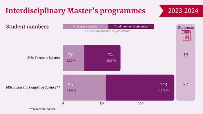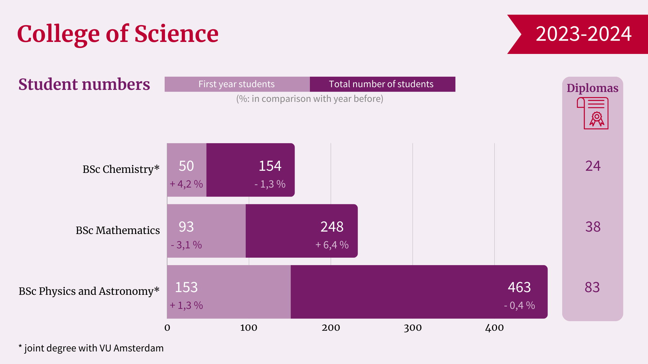 The total number of students and enrolment of first-year students in 2023-2024, also in comparison to the year before, and the number of graduations.