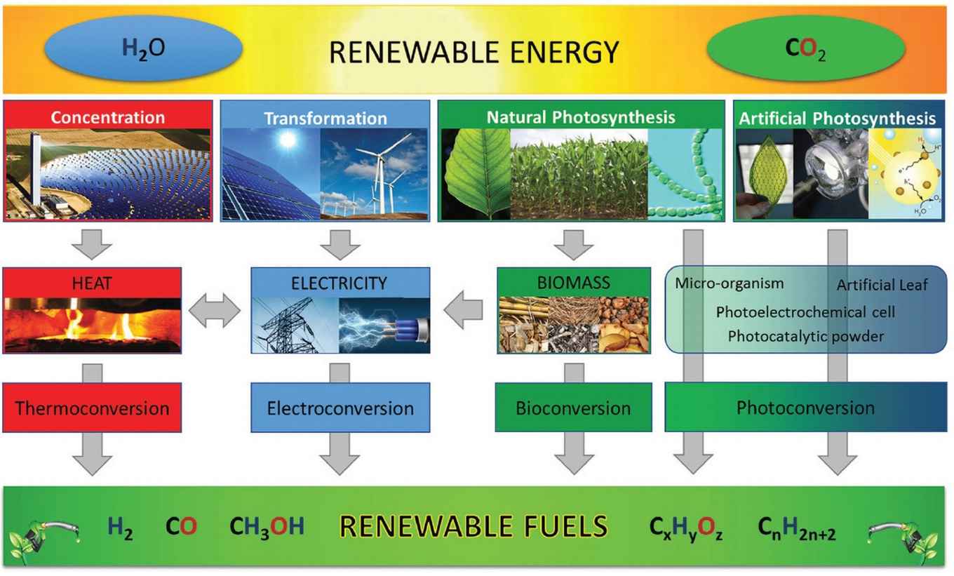 Solar energy driven processes with H2O and CO2 as basic feedstocks can produce 'solar fuels', replacing their fossil-based counterparts. These 'renewable fuels' are key to sustainable future energy systems, not only as an energy carrier in, for example, transportation, but also as a potential storage medium in the power sector. They can also provide fundamental 'green' building blocks for the chemical industry.