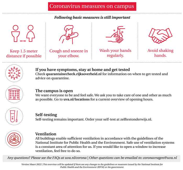 We want everyone to be and feel safe. We ask you to take of one and other by following our guidelines. Go to uva.nl/locations for a current overview of opening hours.