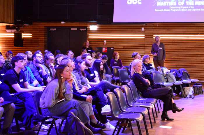 This also comes up during the panel discussion. Six different stakeholders of the programme take a seat on the stage at Pakhuis de Zwijger: domain coordinator of Cognitive Neuroscience Dr. Romke Rouw, domain coordinator of Cognitive Science Dr. Jelle Zuidema, former director and domain coordinator of Translational Neuroscience Dr. Harm Krugers, chair of the alumni network Margot Steijger, lecturer and friend of the programme, Prof. Dr. Richard Ridderinkhof and current MBCS student Max Gippert. Using a quiz, they dive into history, and discuss the future. Current programme coordinator Vincent Tijms leads the discussion, starting with a small introduction: "In the beginning, the programme was unique within the field. Meanwhile, the world is developing with us. This challenges us to explore the boundaries of the domain even more, because at the fringes we can find the biggest and most important challenges."