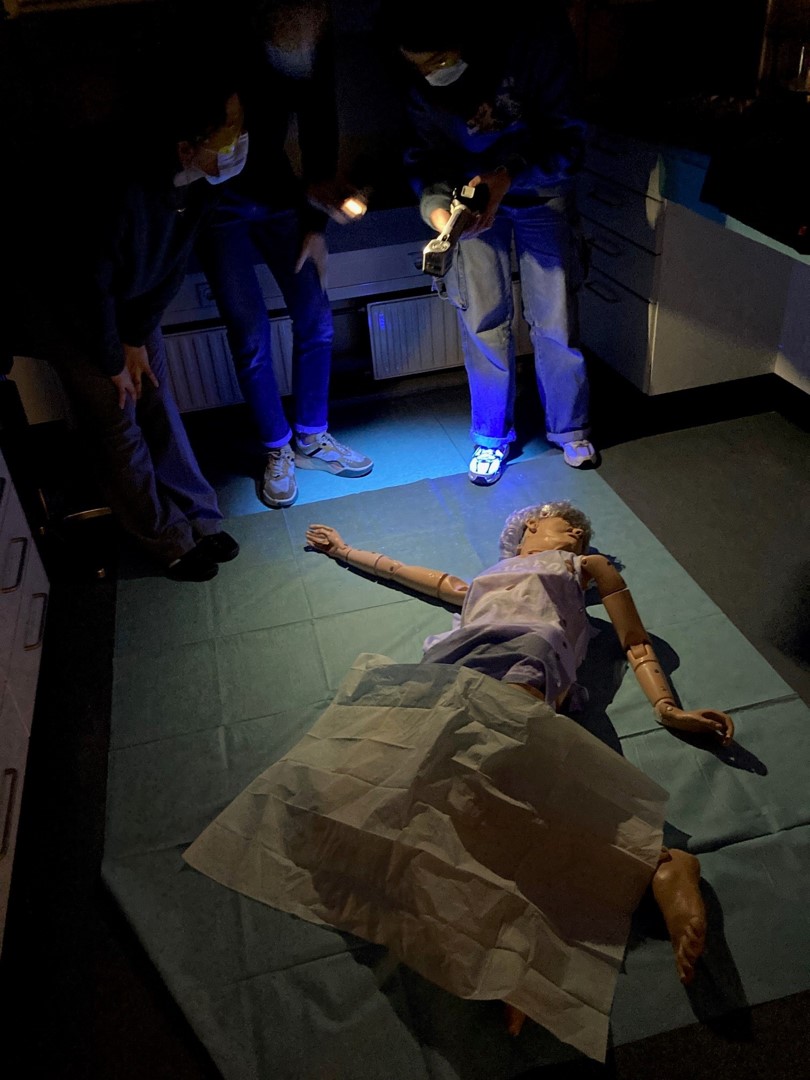 Students engaged in activities such as taking fingerprints and blood samples, extracting data from mobile phones, analysing blood patterns, and using forensic lights to detect biological traces. To further enhance their learning, several MFS alumni currently working in the Dutch Police were invited to guide the students. This not only allowed students to practise actual crime scene techniques but also gave them valuable insights into what it's like to collaborate with the police as a forensic expert.