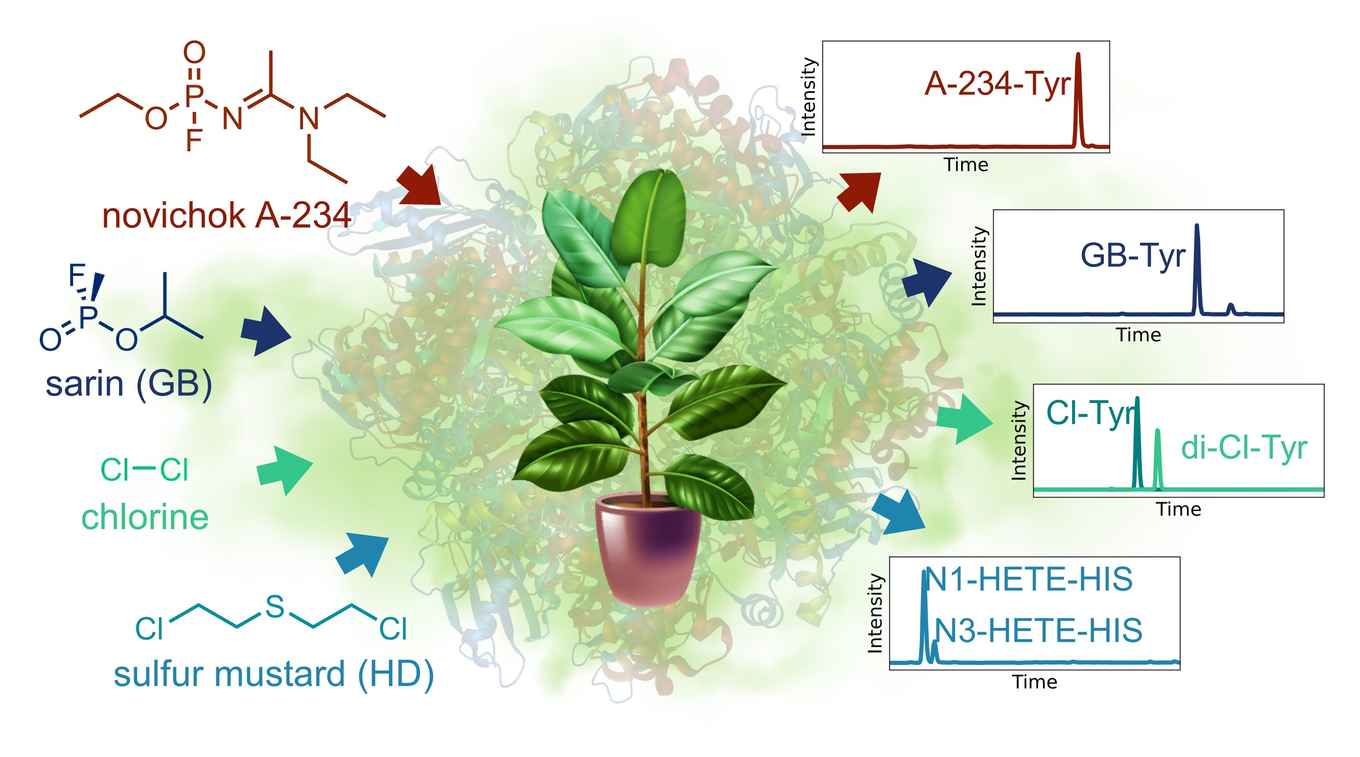 The continuing threats of military conflicts and terrorism may involve the misuse of chemical weapons. The present study aims to use environmental samples to find evidence of the release of such agents at an incident scene. A novel approach was developed for identifying protein adducts in plants.
