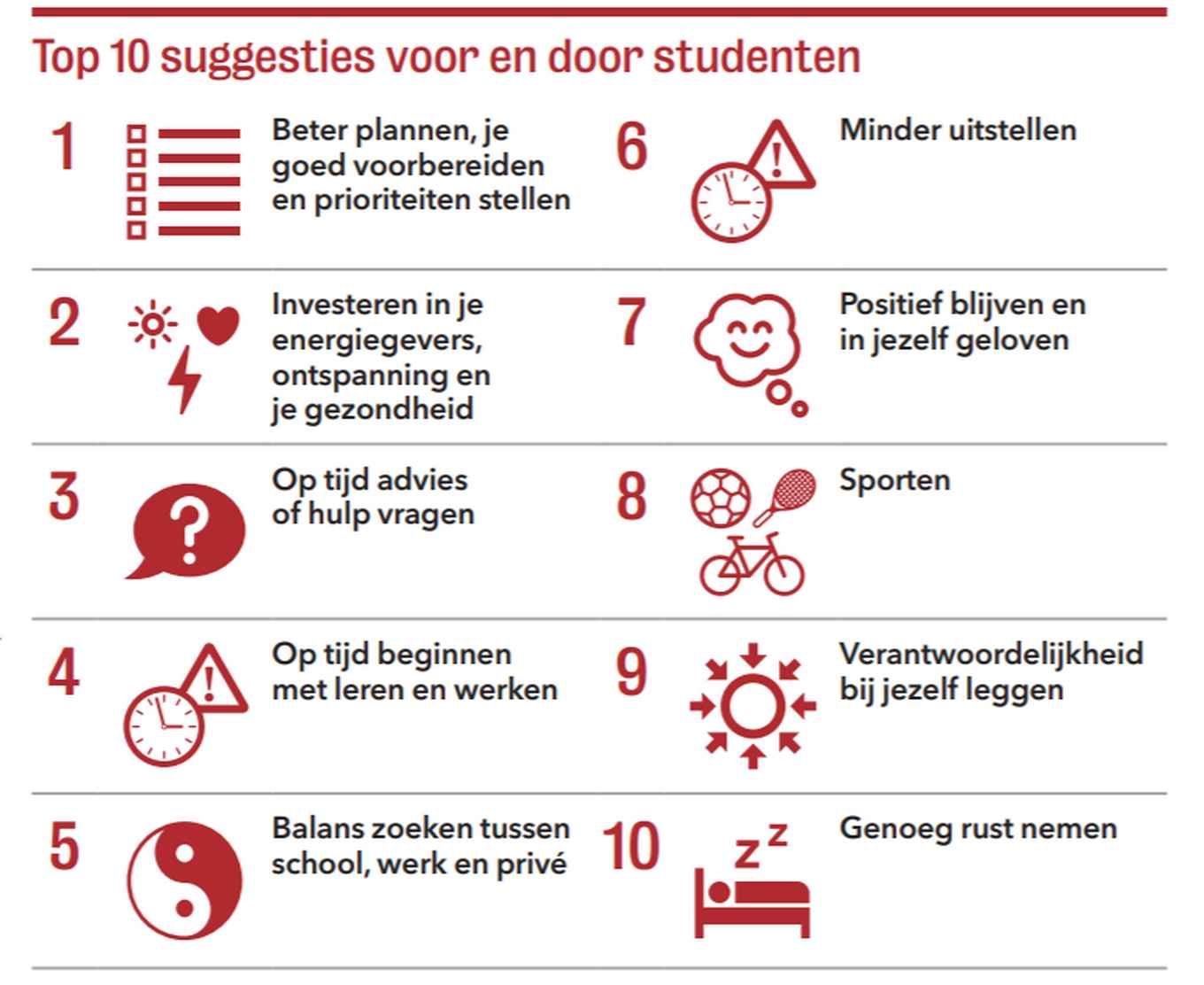 Via mentorgroepen, studieadviseurs en studentdecanen. Ook is er hulp bij persoonlijke problemen studeren met een functiebeperking of als je je wilt heroriënteren op je studiekeuze. We denken ook graag met je mee als je je studieloopbaan wilt combineren met topsport. Lees er alles over bij advies en begeleiding.
