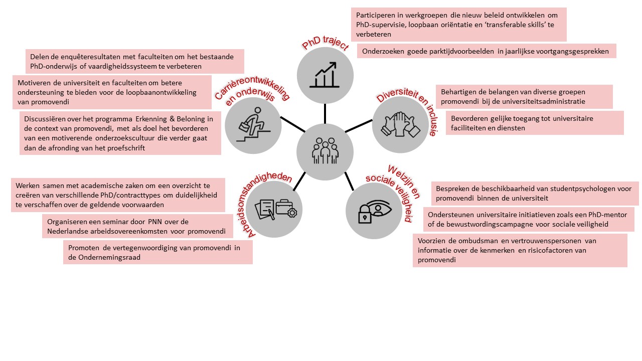 De enquête bevat vragen over een aantal algemene onderwerpen; arbeidsvoorwaarden, onderzoeksomgeving, begeleiding, onderwijs, ondersteuning, voortgang en welzijn, sociale veiligheid, afronding van je promotie, en loopbaanontwikkeling.