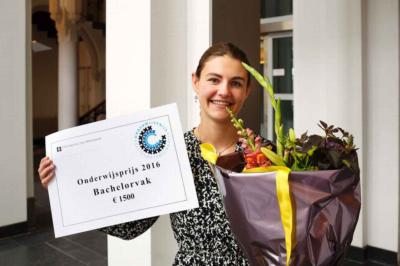 Caitlin Meyer MA neemt namens prof. dr. Fred Weerman de Onderwijsprijs 2016 in ontvangst voor het bachelorvak 'Taalontwikkeling' (Neerlandistiek)