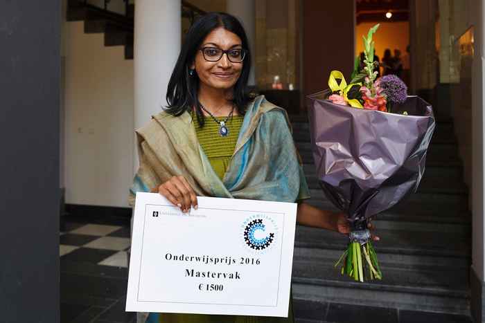 Dr. Sudha Rajagopalan met de Onderwijsprijs 2016 voor het mastervak 'Intimate Politics: Culture and Subjectivity in Soviet and Post-Soviet Russia'