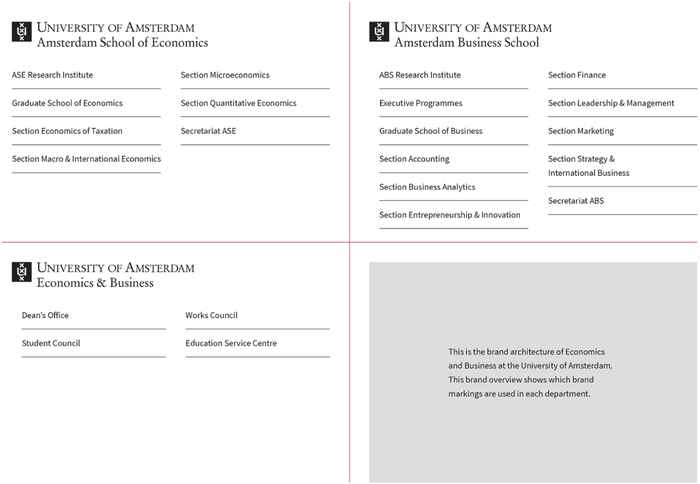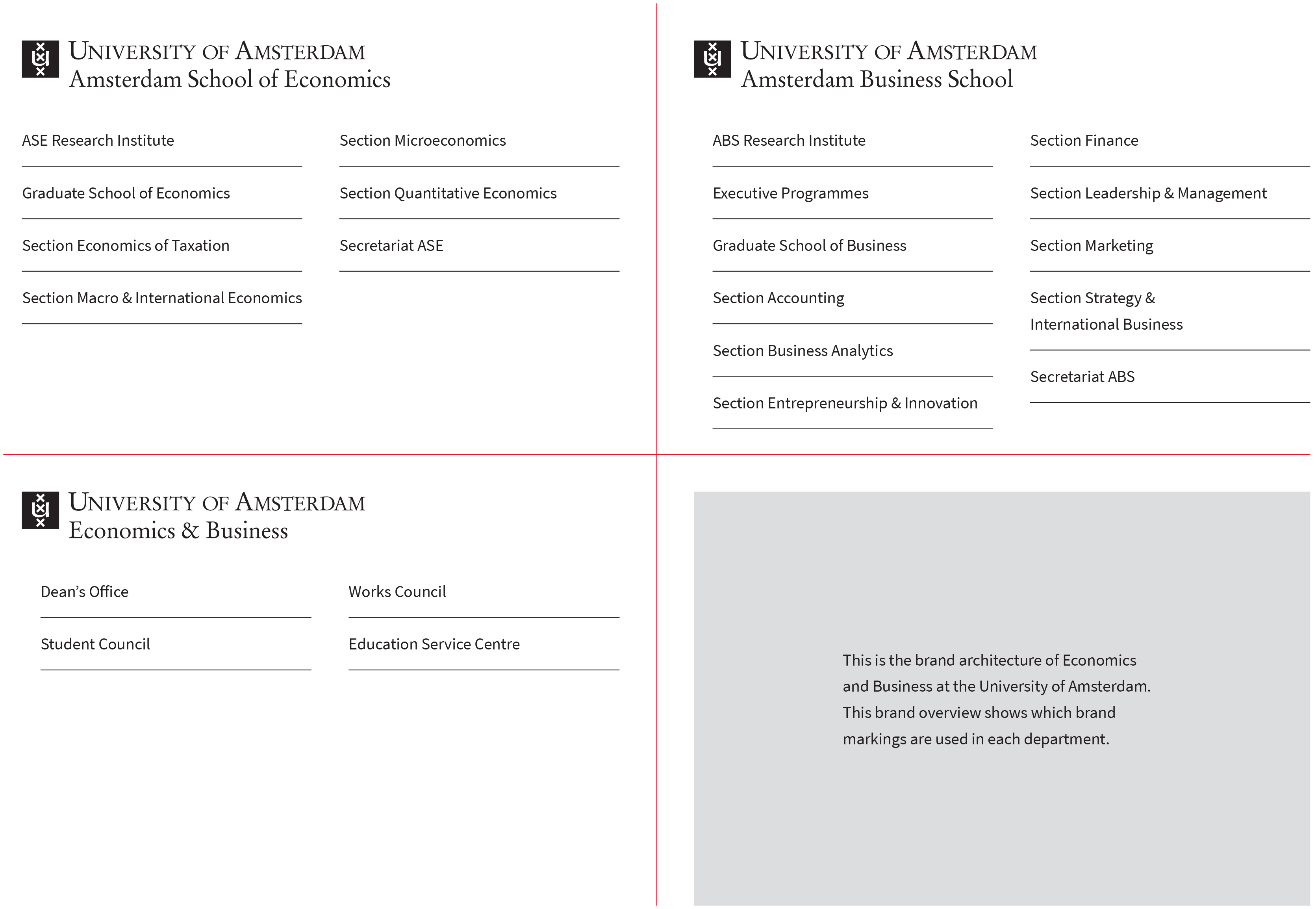 Het is mogelijk om onder voorwaarden één toevoeging te plaatsen, voor extra herkenbaarheid. Dit noemen wij de tweede laag. Het hoofdmerk en de tweede laag versterken elkaar. Namen die in de tweede laag gebruikt kunnen worden, zijn in juli 2019 vastgesteld en zijn hieronder beschikbaar (onder het kopje Downloads). Samen vormen deze logo's de merkarchitectuur van de Universiteit van Amsterdam.