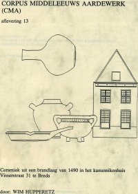 W. Hupperetz, Ceramiek uit een brandlaag van 1490 in het kanunnikenhuis Visserstraat 31 te Breda , Corpus Middeleeuws Aardewerk 13, ('s-Hertogenbosch 1997). De ceramiek die in dit deel wordt beschreven is opgegraven in het huis Vissers-traat 31 te Breda. Al eerder is een vondstcomplex uit dit huis in het CMA opgenomen. Het betrof toen (CMA 9) afval uit een zeventiende eeuwse beerput die in gebruik was toen het huis als herberg dienst deed. De opgraving vondplaats onder eindverant-woording van drs. G. van den Eynde, afdeling archeologie gemeente Breda. Het opgravings-team bestond uit E. Koreman, J. Koreman, H. Gerritsen en de auteur die tevens de dagelijkse leiding had. De opgravingen vonden plaats vanwege de herinrich-ting van de voorruim-te, de aanleg van een nieuwe riolering in de steeg en in de Visserstraat en het uitdiepen van de kelderruim-te. Dit alles speelde zich af in de periode 14 september 1993 tot en met 29 juli 1995. Het huis werd vanaf omstreeks 1480 tot 1567 bewoond door kanunniken verbonden aan het kapittel van de O.L.V.-kerk te Breda. De hoge status van deze bewoners vinden we niet terug in het hier besproken gebruiksaardewerk maar weerspiegelt zich bijvoorbeeld wel in de grote hoeveelheid gebrandschilderd glas die tijdens de brand verloren is gegaan. Op basis van historische en dendrochronologische gegevens kan het aardewerk in een brandlaag gedateerd worden in 1490. De ceramiek uit de brandlaag van het huis Visserstraat 31 te Breda bestaat voor het merendeel uit keukengerei. Waarschijnlijk bevond de ceramiek zich tijdens de brand van 28 augustus 1490 bij de haard in de zuidgevel. Het is vrij uitzonderlijk dat we op deze manier iets van de inrichting van het huis kunnen reconstrue-ren. De spreeuwenpot zal waar-schijnlijk aan de voorgevel (oostgevel) hebben gehangen. Tijdens de brand is het aardewerk in de kelder terechtgekomen aangezien ook het houten plafond van de kelder, tevens vloer bij de haard, moet zijn verbrand.