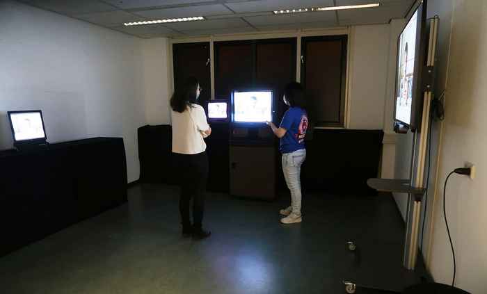 Om dat te onderzoeken, richtten studenten in het lab een kleine tentoonstelling in met twee videokunstwerken. De Roemeense kunstenaar Ciprian Muresan, met wie wordt samengewerkt in het kader van het project STUDIOTOPIA, had hiervoor twee van zijn kunstwerken ter beschikking gesteld. In een verduisterde ruimte maakten de studenten verschillende opstellingen met hetzelfde kunstwerk – op een tablet, flatscreens en oude CRT-monitoren (beeldbuizen), ieder met een eigen uiterlijk en kleur.