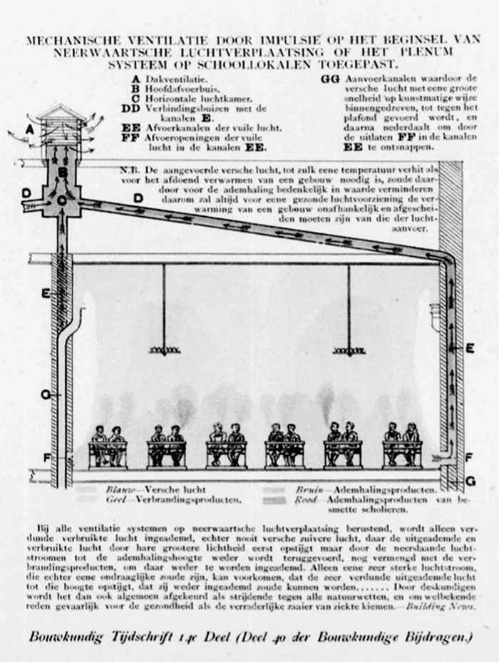 ‘Bedorven lucht’ was vooral een probleem in arbeiderswoningen waar veel mensen op elkaar woonden. Dat gold ook voor grotere gebouwen waar grote groepen bijeen gebracht waren, zoals scholen, ziekenhuizen en gevangenissen. Met de opkomst van de massacultuur ontstonden er nieuwe vormen van vrijetijdsbesteding waaruit de verdere ontwikkeling van openbare gebouwen zoals theaters en concertzalen volgde; en ook die typische negentiende-eeuwse ontwikkeling: het kantoorpand. ‘Deze openbare gebouwen kenden een hoge bezettingsgraad, met vaak een bedroevende luchtkwaliteit tot gevolg’, schrijft Hogen. Woningen waren over het algemeen makkelijk te verwarmen en ventileren, maar grote openbare gebouwen waren voor het binnenklimaat afhankelijk van complexe mechanische installaties. Het functioneren van deze installaties was vervolgens in grote mate afhankelijk van het ontwerp van het gebouw - denk aan de plaatsing van verwarmingskamers, opstelkamers voor installaties, opslag en distributie - en zodoende van grote invloed op de uiterlijke verschijning ervan.