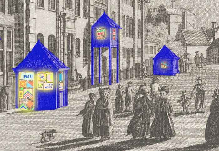 Detail uit een Amsterdamse gravure met door kunstenaarsduo Hertog Nadler ingekleurde loofhutten