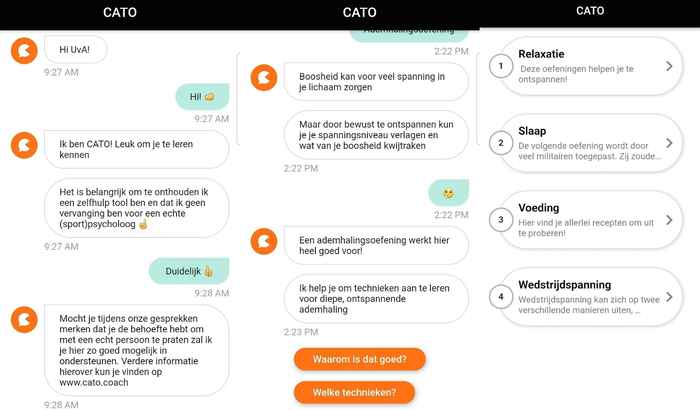 ‘De chatbot vraagt aan de sporter hoe het gaat op een schaal van -2 (heel slecht) tot +2 (heel goed). Als de sporter aangeeft dat hij of zij zich niet goed voelt, kan de chatbot vragen wat de sporter precies ervaart, bijvoorbeeld piekeren. De chatbot kan dan strategieën aanreiken zoals ademhalings- of ontspanningsoefeningen of aanraden om dingen op te schrijven die goed gingen en die minder goed gingen. CATO kan ook video’s met oefeningen of andere informatieve inhoud tonen. Het gaat erom dat ze leren omgaan met emoties – zowel negatief als positief trouwens. Als sporters aangeven dat ze zich trots voelen bijvoorbeeld, dan geeft CATO wellicht de tip om daarbij stil te staan door een foto te maken van dit geluksmoment. Maar uiteraard zullen sporters eerder de chatbot raadplegen als ze negatieve emoties ervaren. Sporters kunnen zelf overigens ook het gesprek starten of direct een ‘toolbox’ met allerlei tips openen.’