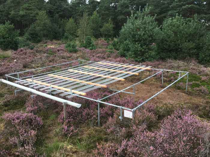 Een deel van het heide-experiment, waarmee de biologen kijken naar het langjarige effect van droogte op dit type ecosysteem. Foto: UvA/IBED