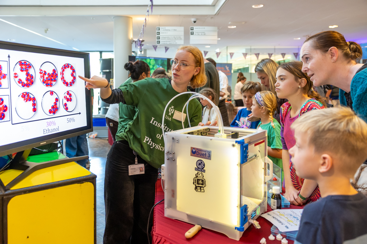 De FNWI was één van de vele deelnemers en presenteerde interactieve demonstraties en nieuwsgierigmakende experimenten, waarbij bezoekers natuurlijk de kans kregen om zelf aan de slag te gaan.