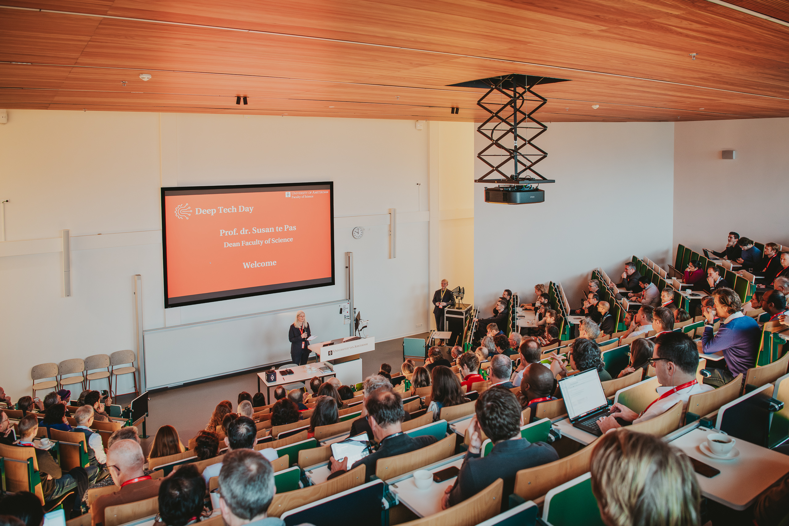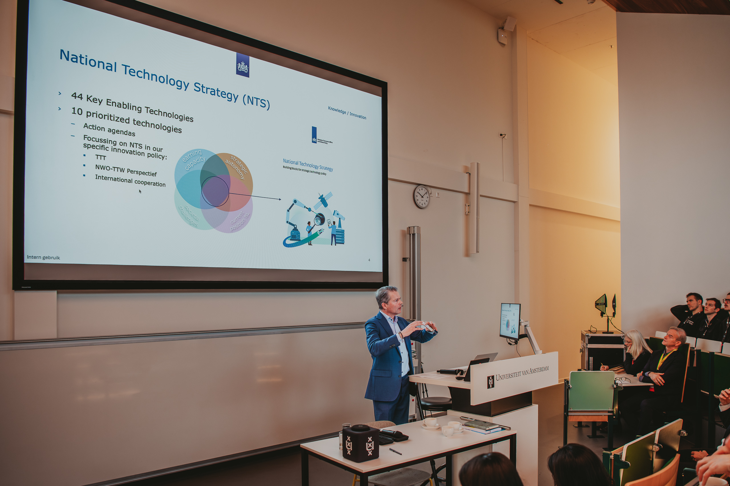 Na een openingswoord van Susan te Pas, decaan van de UvA FNWI, werd de plenaire sessie vervolgd met een keynote van Tjerk Opmeer (directeur Innovatiebeleid, Ministerie van Economische Zaken). Hij besprak de bredere context van deep-tech onderzoek in Nederland en lichtte de Nationale Technologiestrategie (NTS) toe.