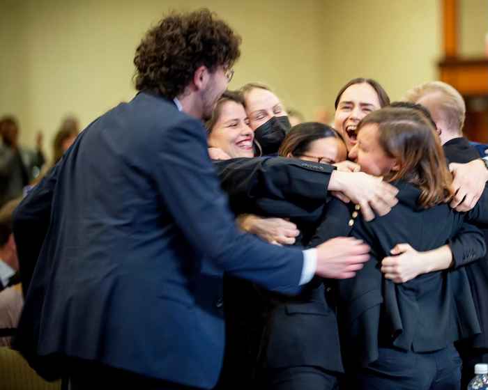 De Faculteit der Rechtsgeleerdheid van de UvA neemt de trofee over van Harvard Law School die vorig jaar de competitie won. ‘We hopen er een mooie plaats voor te vinden op onze campus’, zegt Sophie.